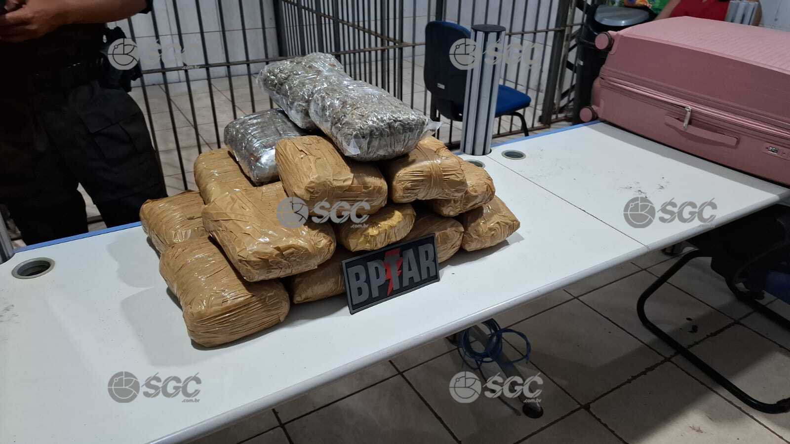 Durante a revista no interior do veículo, os militares encontraram uma bolsa rosa contendo diversos tabletes de entorpecentes. Ao todo, foram apreendidos aproximadamente 21 quilos de drogas, sendo cerca de três quilos de skank e 17 quilos de maconha.